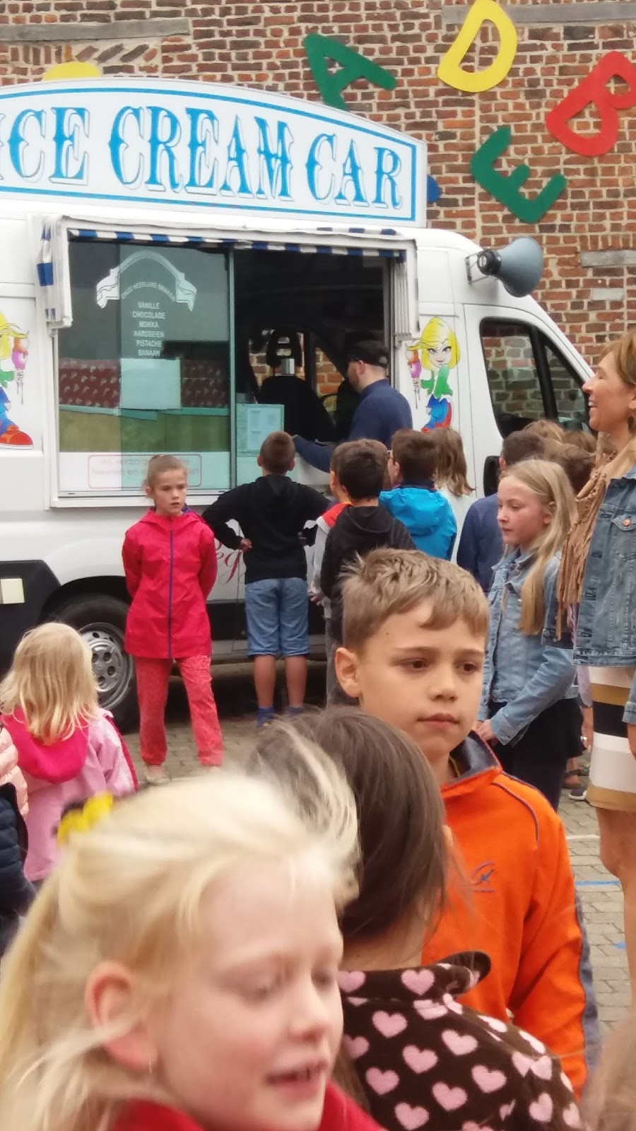 Donderdag kwam de ijskar, deden we een dansje en werden de kinderen van groep 9 buiten gerold.